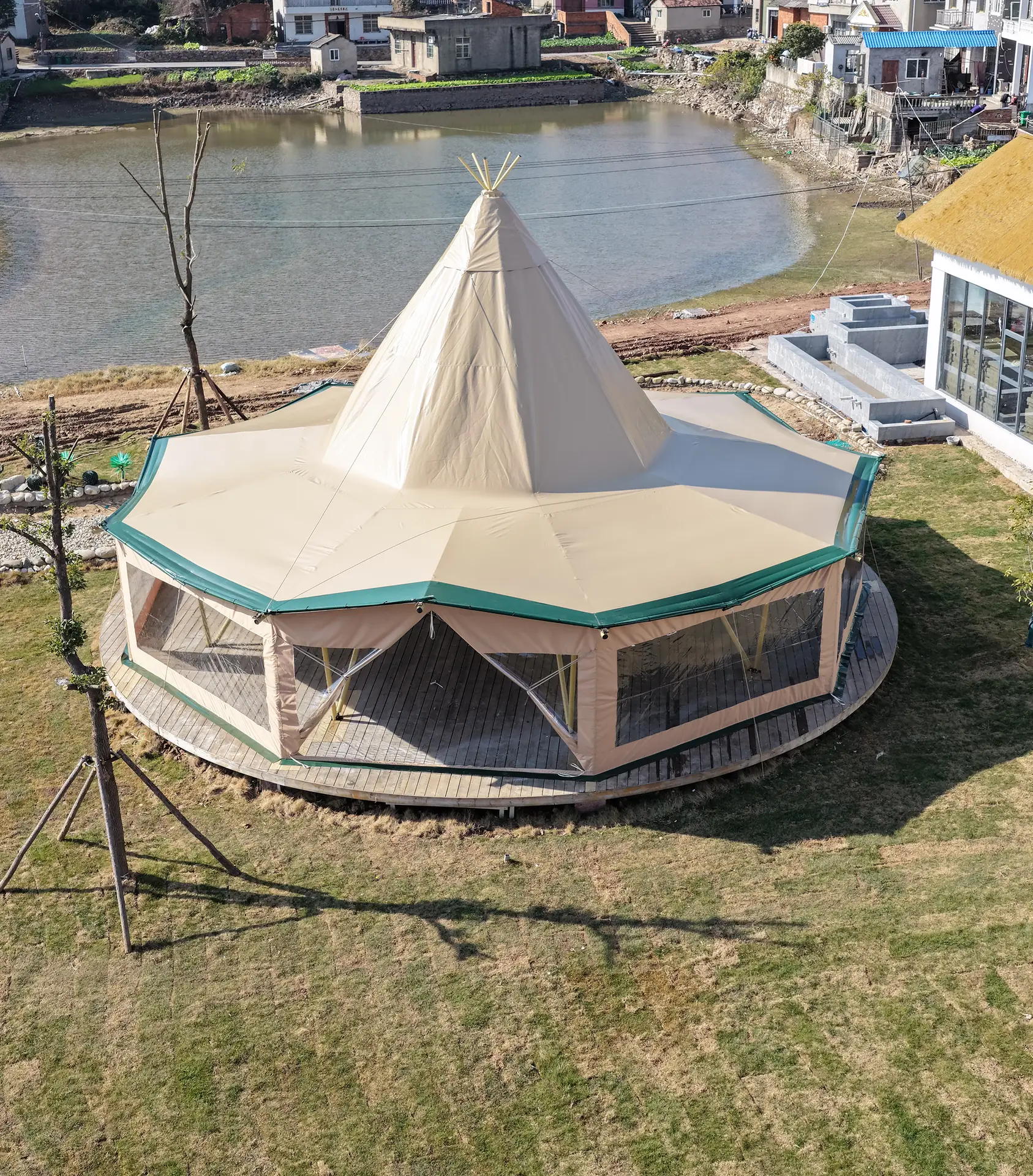 Tepee tents are inspired by traditional Native American tipis, featuring a distinctive and recognizable shape with an open top design for ventilation and smoke exhaust. They are ideal for themed campsites, family-friendly parks, specialty dining, and outdoor leisure, creating a strong natural and exotic atmosphere.