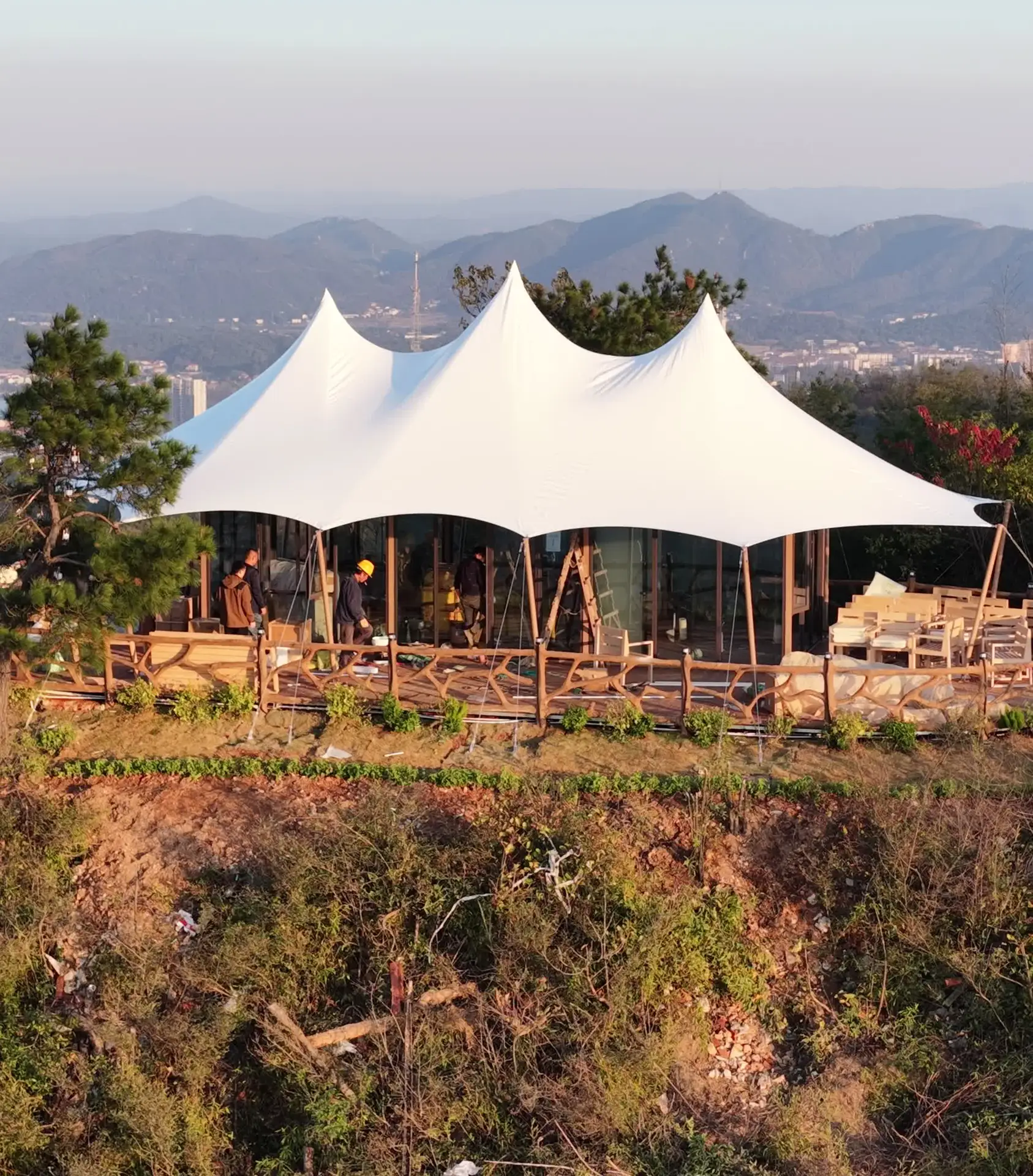 Sailing tents primarily feature tensile membrane structures with a sleek, boat-like shape that conveys a sense of motion and modernity. Lightweight with large spans, they are suitable for entrance landmarks, event pavilions, lounge areas, and commercial outdoor spaces, providing both sun and rain protection as well as decorative appeal.